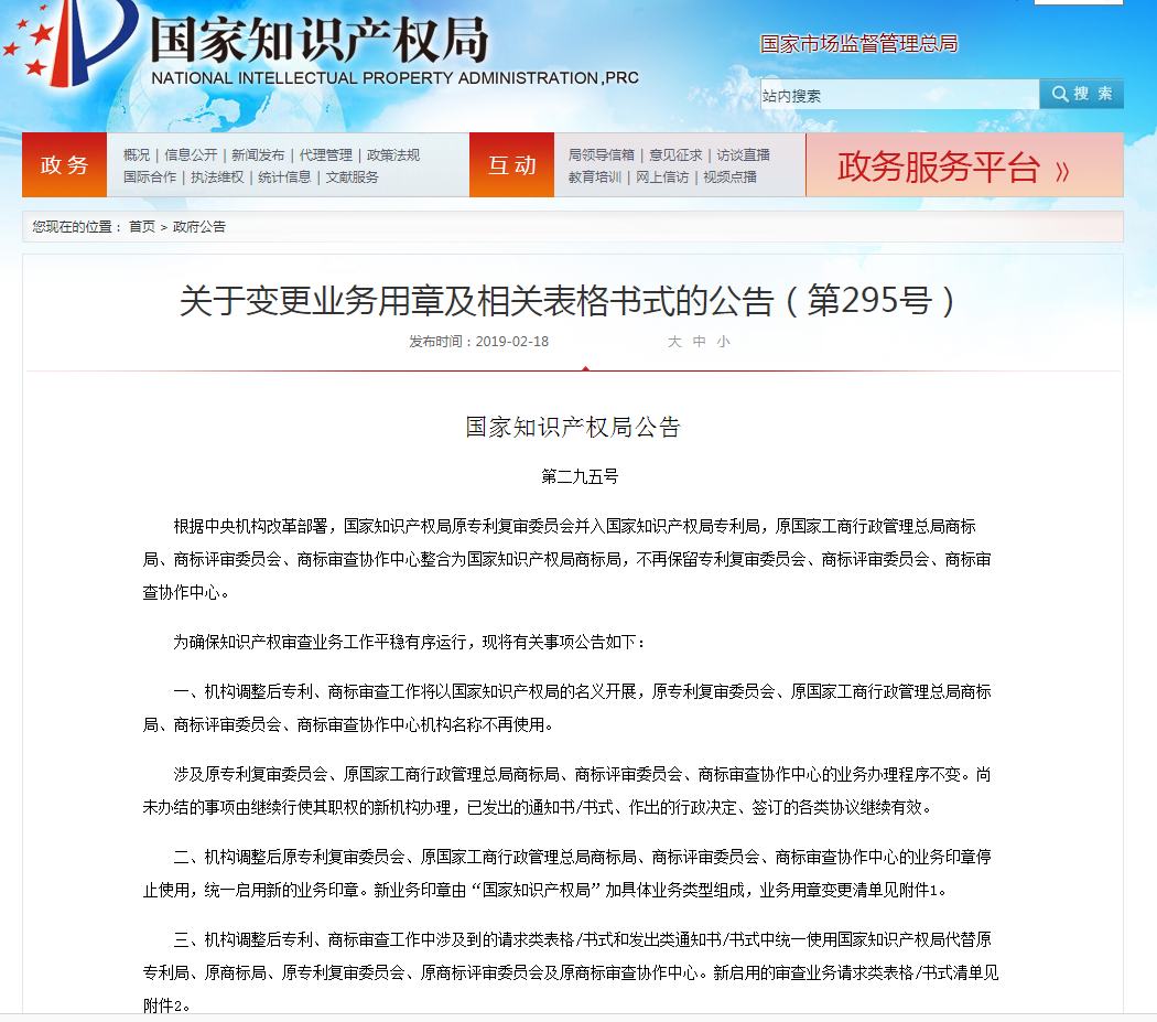 根據(jù)中央機(jī)構(gòu)改革部署,國家知識產(chǎn)權(quán)局原專利復(fù)審委員會并入國家知識產(chǎn)權(quán)局專利局,原國家工商行政管理總局商標(biāo)局、商標(biāo)評審委員會、商標(biāo)審查協(xié)作中心整合為國家知識產(chǎn)權(quán)局商…