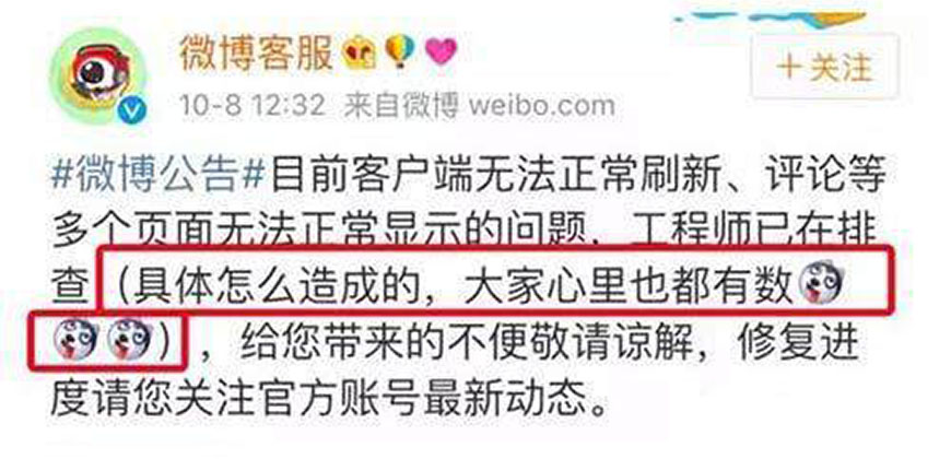 10月8日,國(guó)慶長(zhǎng)假最后一天的中午12點(diǎn)“國(guó)民校草”在微博上給了眾粉絲一波甜蜜暴擊,公布了與“國(guó)民閨女”的戀情。這波暴擊一出,可苦了微博的程序小帥哥了。一度造成新浪微博癱瘓大半天。也炸得無(wú)數(shù)吃瓜網(wǎng)友一臉懵逼。