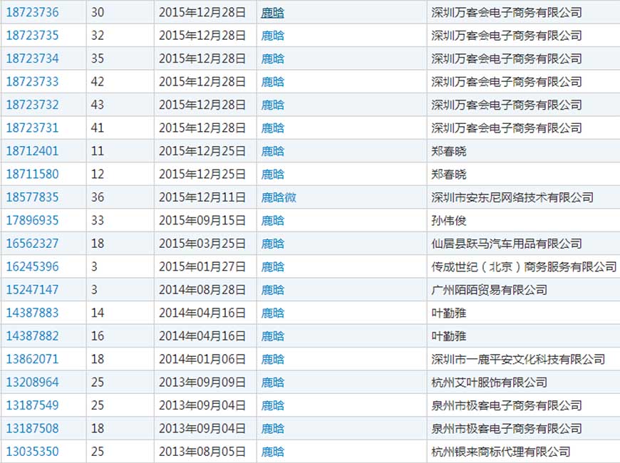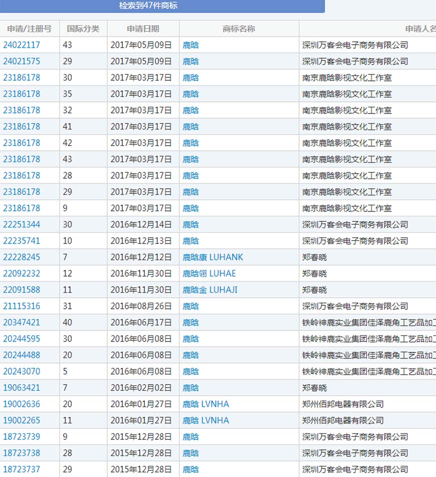 小編通過(guò)檢索發(fā)現(xiàn),目前共有47件“鹿晗”或者包含“鹿晗”的商標(biāo)申請(qǐng),從這些申請(qǐng)人中有個(gè)“南京鹿晗影視文化工作室”申請(qǐng)人,通過(guò)查詢了解到這個(gè)是鹿晗所屬工作室,鹿晗的很多官方信息都是這個(gè)工作室發(fā)布的。最早商標(biāo)申請(qǐng)日為2013年8月5日。而最早申請(qǐng)這個(gè)商標(biāo)的申請(qǐng)人并不是“南京鹿晗影視文化工作室”。那說(shuō)明“鹿晗”這個(gè)商標(biāo)早就被人搶注了。