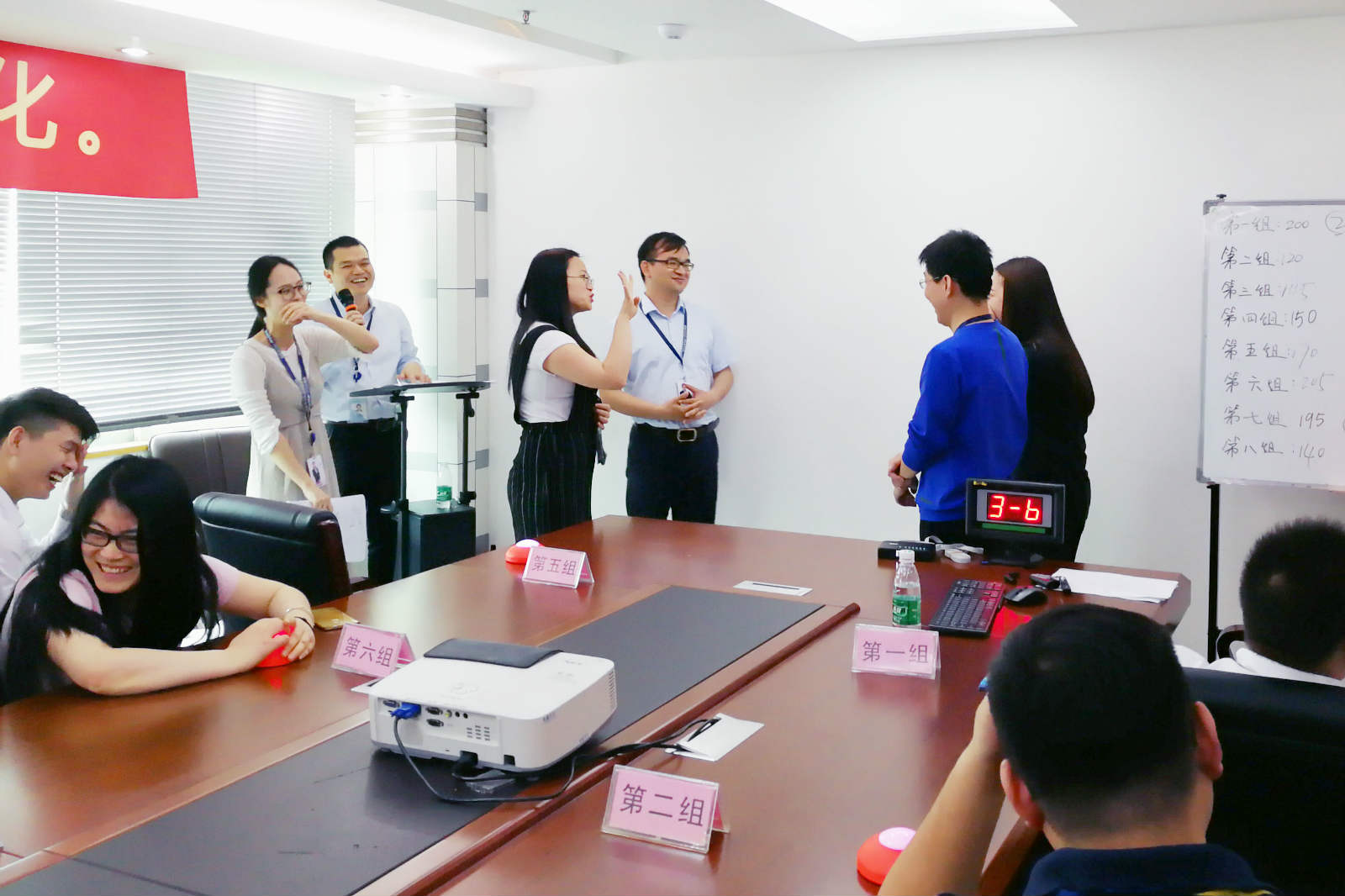 進過一番激烈的爭斗,團隊搶答賽也迎來了尾聲,經(jīng)過第一、二環(huán)節(jié)成功角逐出前三名,他們分別是:第一名、廖建旋率領(lǐng)的第六組,第二名、張淑微率領(lǐng)的第一組,第三名、劉澤率領(lǐng)的第七組,祝賀他們。