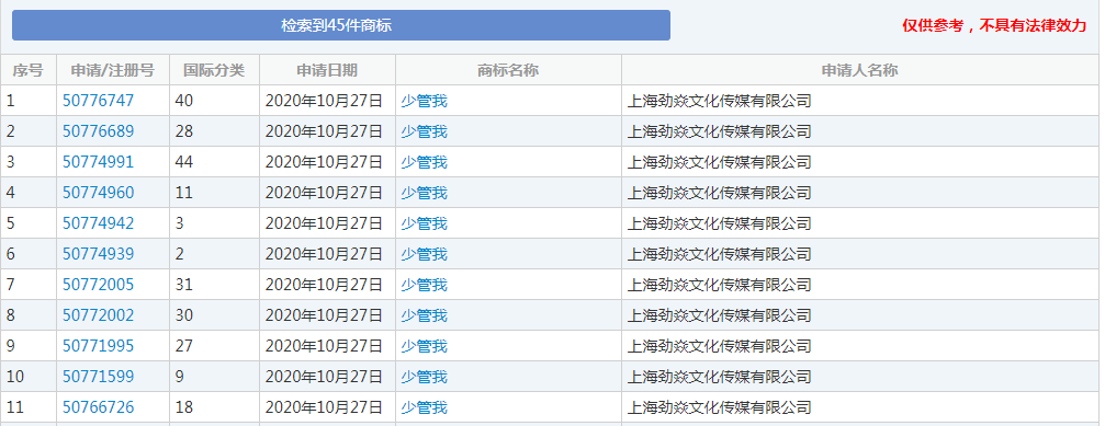 據(jù)商標(biāo)網(wǎng)查詢,周深擔(dān)任股東的上海勁焱文化傳媒有限公司開(kāi)始申請(qǐng)注冊(cè)“少管我”商標(biāo),商標(biāo)數(shù)量總計(jì)45個(gè),屬于全類(lèi)別保護(hù)。