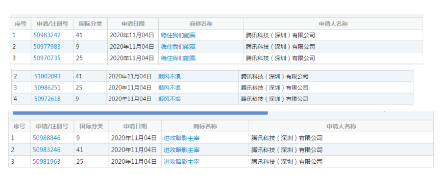 其實(shí),將自身關(guān)聯(lián)性高、原創(chuàng)的詞語(yǔ)進(jìn)行注冊(cè)成商標(biāo),并不是只有周深意識(shí)到了其中的重要性和價(jià)值,就在不久之前,騰訊就曾申請(qǐng)注冊(cè)“穩(wěn)住我們能贏”、“保護(hù)我方輸出”、“進(jìn)攻暗影主宰”、“順風(fēng)不浪”、“逆風(fēng)不倒”、“我拿BUFF”等商標(biāo),這幾句話均與騰訊旗下《王者榮耀》等手機(jī)游戲相關(guān)。